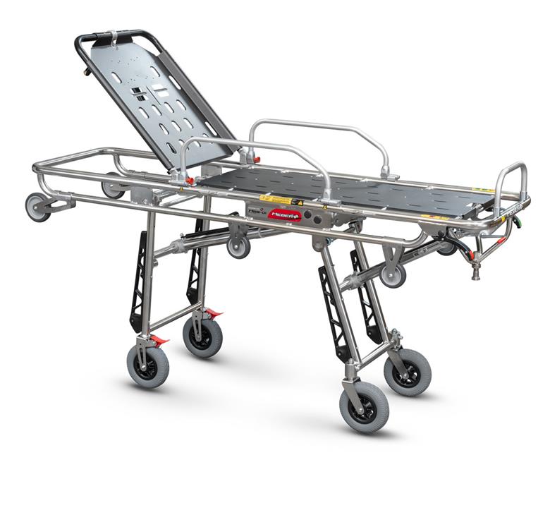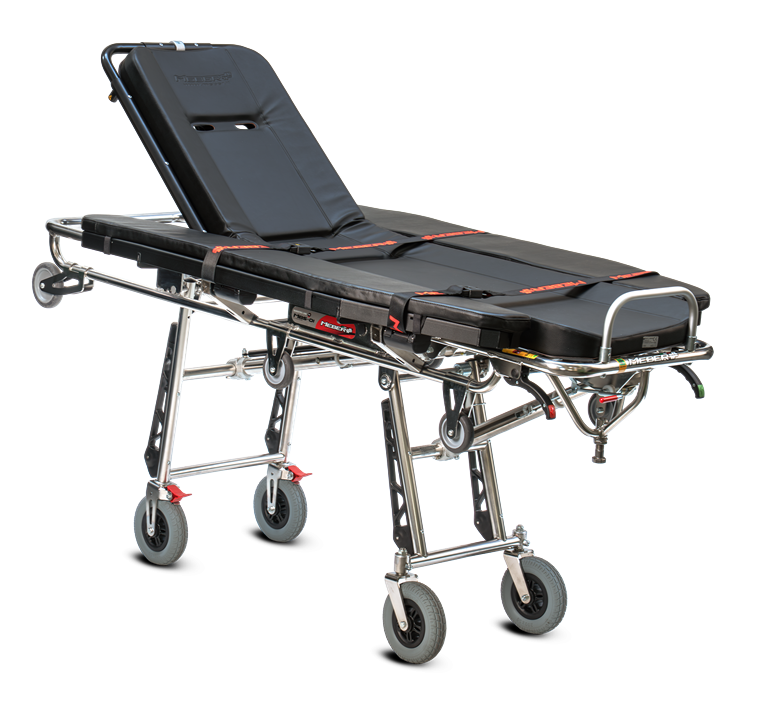 Self loading stretcher for bariatric transport Self loading stretcher for bariatric transport made of a special high resistance stainless steal alloy. The frame is renforced to ensure a 350 kg maximum payload compared to others MeBer self loading stretchers. It is supplied with 2 frontal Ø125x25 and 2 back Ø125x25 wheels for maximum safety during loading operations. The increased 4 Ø200 mm wheels, 2 fixed with brake and 2 rotating with self-centring system, allow easy manoeuvrability even with heavy loads. The rigid platform, composed by aluminium, is easy to clean and disinfect. It also has an adjustable backrest with lockable gas spring for inclinations from 0° to 80° and fully folding sides. Vertical legs are protected by plastic buffers. This stretcher is supplied complete with mattress (art. 7013) and belts (N. 2 art. 608-A/MEB or 608-N/MEB and n. 1 art. 612/AN-2/MEB or art. 612/N-2/MEB).