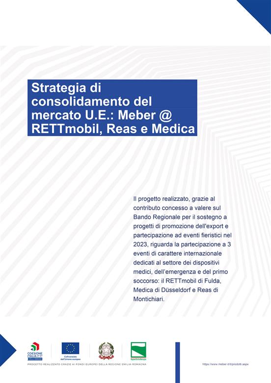 Rendiamo nota la partecipazione al bando Regionale per il Sostegno a progetti di promozione dell’export e partecipazione a eventi fieristici 2023. Il progetto realizzato, grazie al contributo concesso a valere sul Bando Regionale per il sostegno a progetti di promozione dell'export e partecipazione ad eventi fieristici nel 2023, riguarda la partecipazione a 3 eventi di carattere internazionale dedicati al settore dei dispositivi medici, dell’emergenza e del primo soccorso: il RETTmobil di Fulda, Medica di Düsseldorf e Reas di Montichiari.