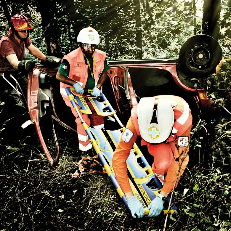 A margine della manifestazione Me.Ber. ha testato uno dei primi esemplari della nuova barella a geometria variabile Ergon. Con la collaborazione della Croce Blu di Modena, sotto il coordinamento operativo del Dott. Rami (responsabile sanitario Pubblica Assistenza di Parma), è stata eseguita una simulazione di recupero con estricazione da un’auto riversa in un burrone.