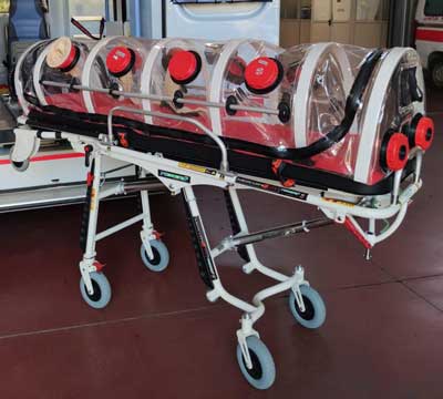 - Modalità a pressione negativa: in questo primo caso si protegge l’ambiente esterno dal paziente infetto “contenuto” all’interno del sacco. Può trattarsi di un trasporto primario di un paziente ad alto rischio infettivo, oppure di un trasporto secondario all’interno di una particolare struttura di un paziente affetto da agenti microbiologici