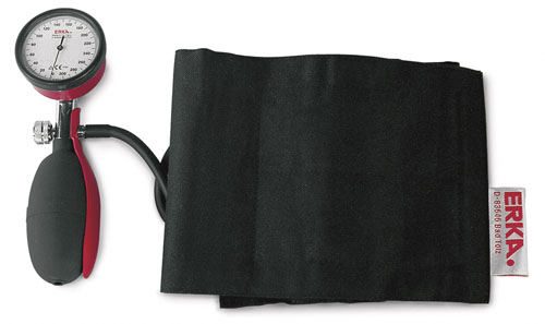 Red palm-style aneroid sphygmomanometer plusØ 48mm. Precision sphygmomanometer with protective ring and extremely sensitive deflation valve. Anodised aluminium.