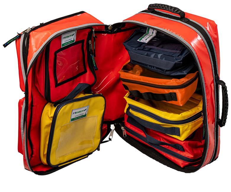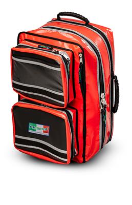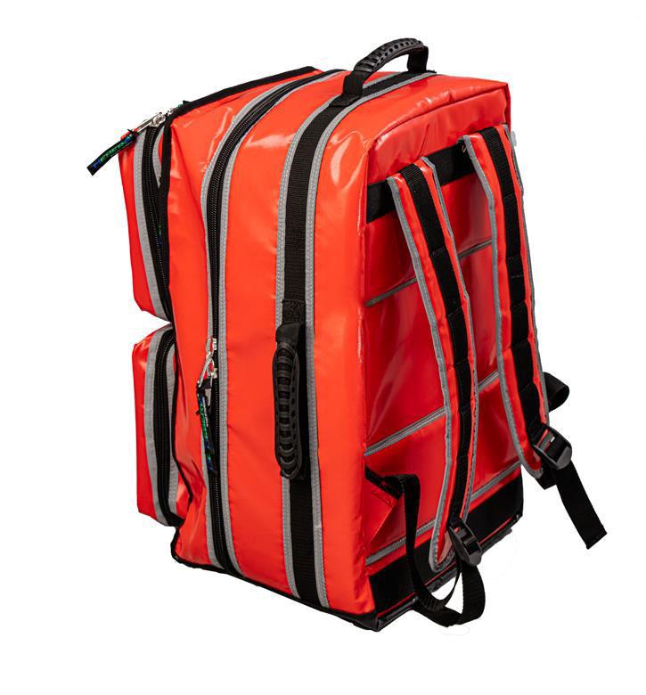 Rescue backpack “Romeo” Red Emergency bag made in closed-cell PVC, with PVC bottom, plastic supports and upper transparent pocket for customizations. Compact but roomy, thanks to its internal modularity it allows the organization of space in a personalized way in order to optimally house what is necessary for emergencies. 4 pockets, 2 on the sides, one front and one rear, predisposed with supports and rubber bands. It is also equipped with an additional removable bag with transparent front. Thanks to its construction, it allows internal cleaning and disinfection. Portable by hand, shoulder strap or as a backpack.