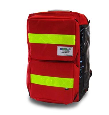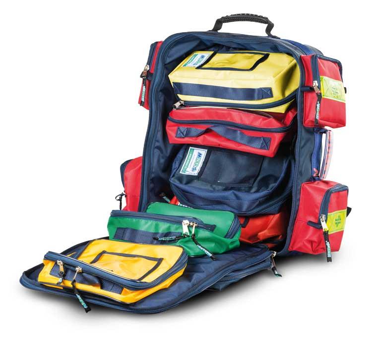 “Ambumed” rescue knapsack New modular knapsack, practical, compact, simple and suitable for rescue volunteers and professionals. Externally it is made of blue tear-resistant double sewing nylon, sturdy 10 mm zips, reflective high visibility stripes on all sides and a closed- cell PVC bottom, with plastic supports. On the inner side there is a protective hard shell structure made of thermoplastic material, which consists of a central wide space, characterized by a double-zip opening, and 4 external side pockets. The central space is supplied with Velcro® stripes for holding 4 coloured pockets, each ones supplied with a large transparent window reinforced with double sewing, and 2 professional bags to store and organize different tools and materials. This knapsack is completed by a frontal pocket with inner straps to secure different objects, 3 anti-slip rubber handles (1 on the upper side and 2 on lateral sides) to carry by hand and, on the back side, 2 shoulder bands with reflecting stripes.Ambumed is complete with 4 pockets (Art. 1362-002) and 2 professional bags (art. 1362-001).