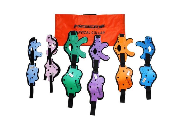 Cervical collar set 6 pieces with carrying case GEMINI cervical collar is an higly professional instrument indispensable for the emergency operator. Composed by 2 parts, it is positioned in the front and rear part of the neck allowing thus a perfect immobilization of the rachis. Central hole for tracheotomy, easy to be used and adjust thanks to the rip-off fastening. Made with stamped polyethylene coloured to identify various size and E.V.A. washable inner lining fixed by plastic rivets. Available in 6 different size.Main features