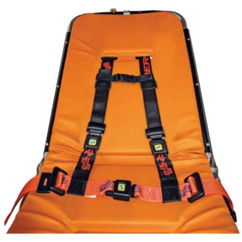 Adjustable thoracic abdominal belt orange/black with MeBer band and 4 points fastening for self loading stretchers and sedan chairs Adjustable thoracic abdominal belt orange/black with MeBer band and 4 points fastening for self loading stretchers and sedan chairs.