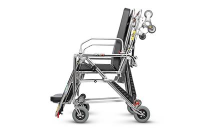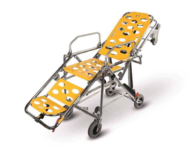 “EVOX” certified self-loading stretcher convertible into chair complete with mattressThe self loading stretcher EVOX enables to settle the patient with the most comfortable position for its rescue and transport. Its conversion into chair allows access in all those confined spaces, such as elevators and hallways with tight corners, where a common stretcher cannot easily be manoeuvred . A gas pistons system allows to adjust EVOX in infinite positions until reaching the sitting position, relieving the operator from any sort of effort. Frame in stainless steel electro-polished, polyurethane wheels Ø 200mm, safety command to prevent accidental closure, mattress divided into four separate sections and an attractive design are the ultimate features of this device, always more required by the markets. An innovative system, consisting of four “balancing” loading wheels, allows to load Evox on different stretcher supports. Thanks to the appropriate lock in conjunction with the fixing system art. 962, the stretcher chair EVOX art . 7112I PROOF is able to withstand shocks up to 10g in all directions, as regulated by the UNI EN 1789 norm, as well as AIS125 certified. The ability to accommodate patient in the most congenial position, makes Evox the ideal solution also for all the emergency waiting rooms.