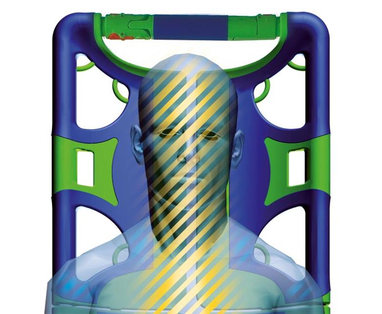 Besides patient's comfort, ERGON is designed to assist rescuers and operators thanks to unique solutions. The handles are upholstered in HC3 and present a 20° inclination, thus allowing a better grip. Dedicated eyelets and supports were integrated for the fastening of straps and carabiners. When split, the distance between the two halves measures 25 mm: this ensures excellence support to the spinal column, in contrast with regular scoop stretchers which presents an 80 mm distance. The shape of the blade is also larger than usual and is easily placed between the patient and the ground. The employment of HC3 material, besides conferring excellent structural stability, ensures great thermal insulation. This feature prevents hypothermia and allows for a longer stay of the patient on the Ergon stretcher, thanks to its design.