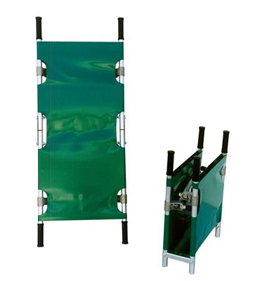 Short folding stretcher for veterinary useStretcher that folds in two, equipped with feet and handles, aluminium frame and PVC impermeable and tear-resistant bed. Ideal for in- surgery transport, easily positioned dimensions.