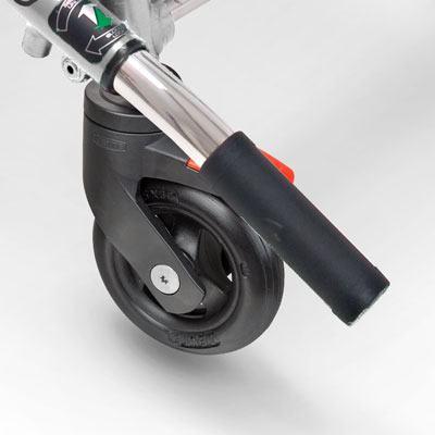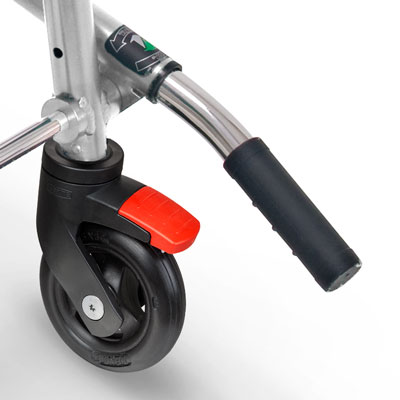 Ruote posteriori di elevate dimensioni per il massimo comfort e freno sulle anteriori, ideale quando si trasporta la sedia chiusa in ascensore.